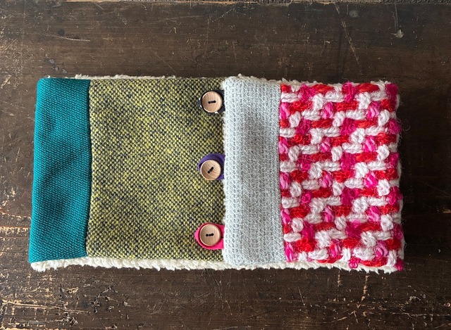 色々な暖か生地を組み合わせた ネックウーマーです。 内側はオフ白のふわふわした生地なので 肌触りが気持ち良いです。 ボタンを止めるループも 端切れを使って3つとも変えてみました。 ぐるりと首に巻くだけなので 着脱が簡単でアクセントにもなり 尚且つ暖かい! おすすめです。 縦 約14cm 横 約60cm