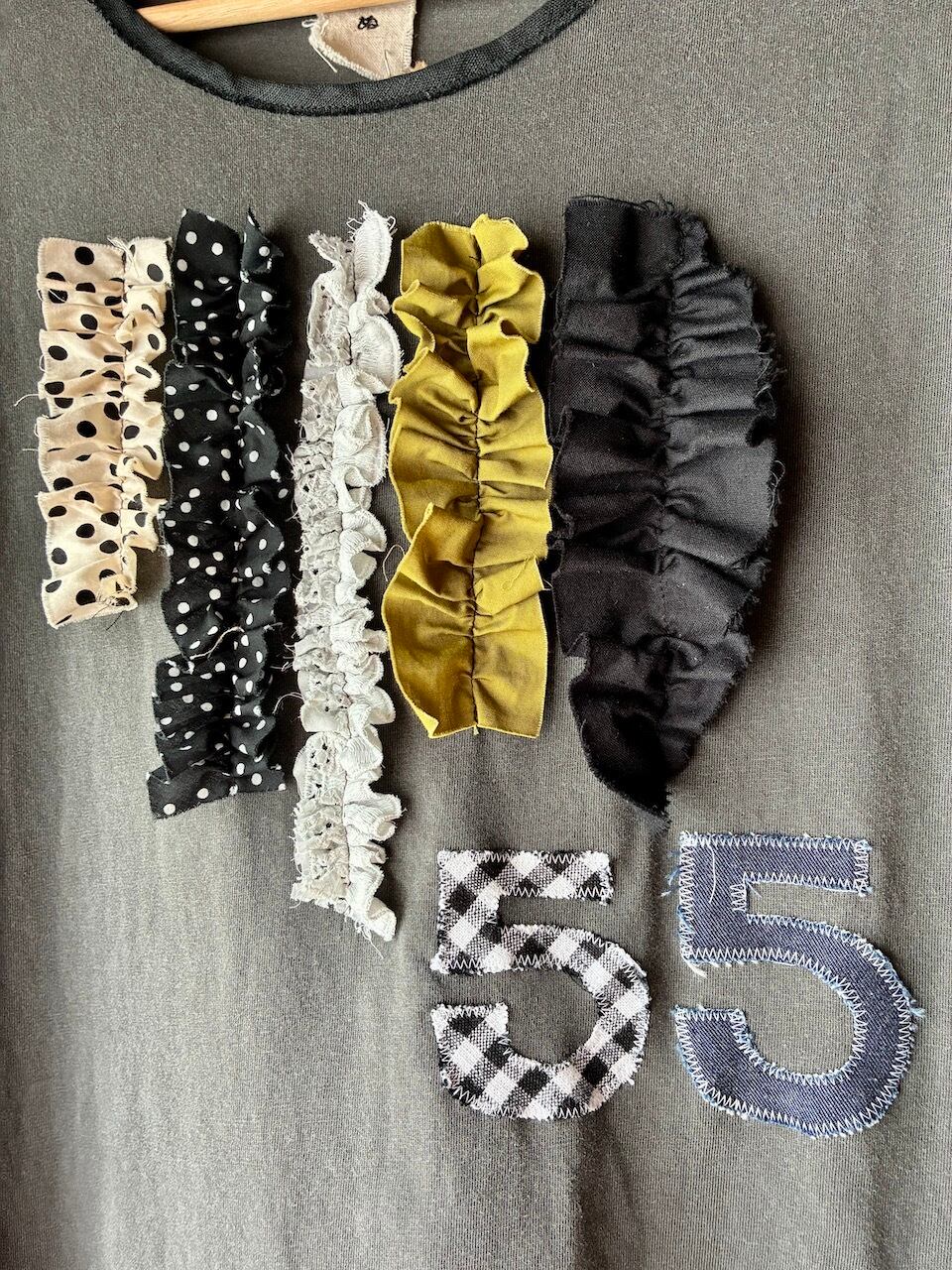 モノトーンのハギレをフリルにして縫い付けました。