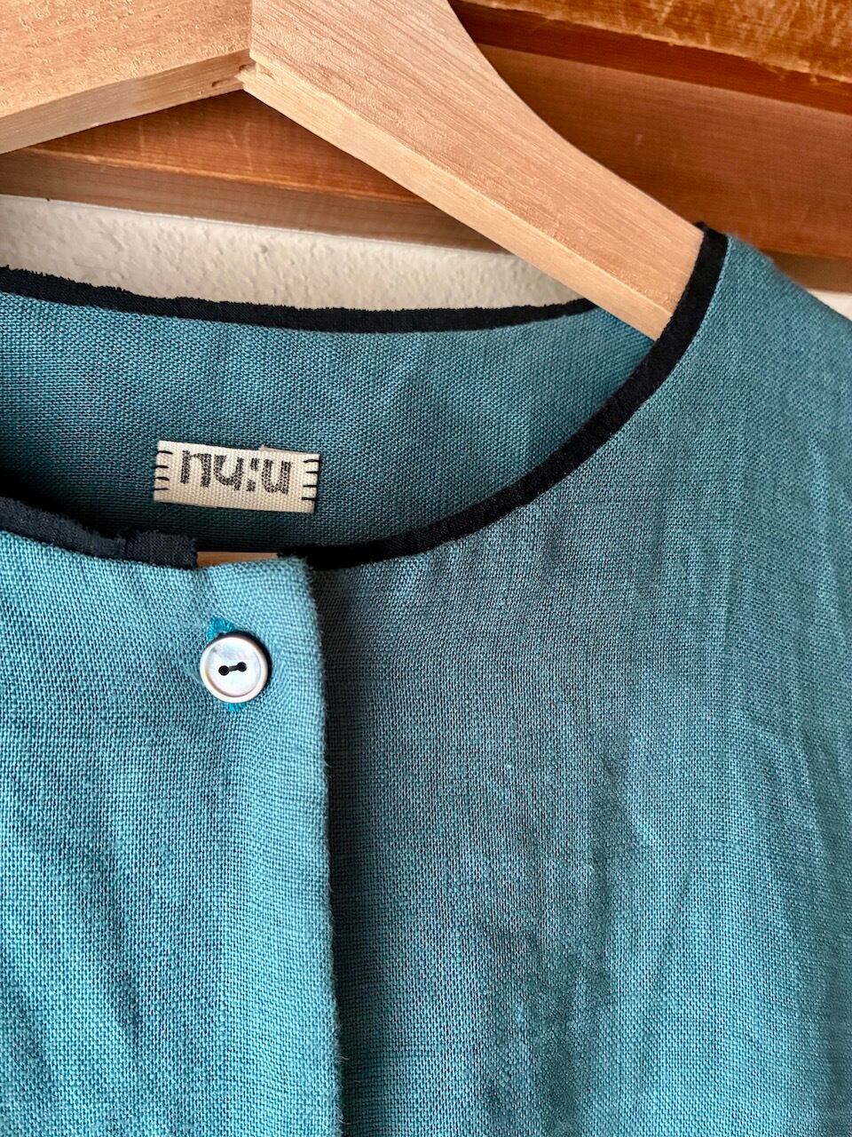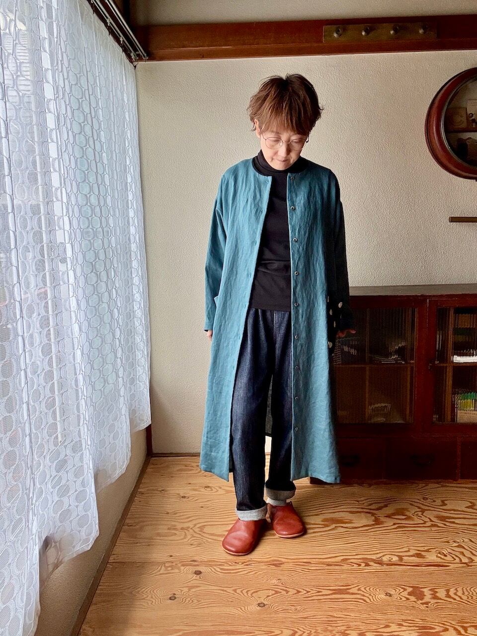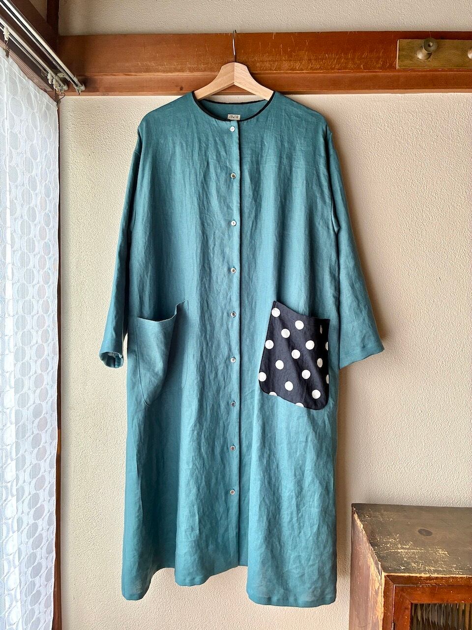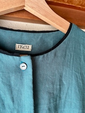 ノーカラーワンピース/リネン・スモークターコイズ