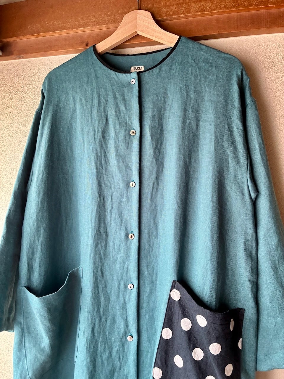 襟ぐりには切りっぱなしのアクセントカラーを挟み込んで