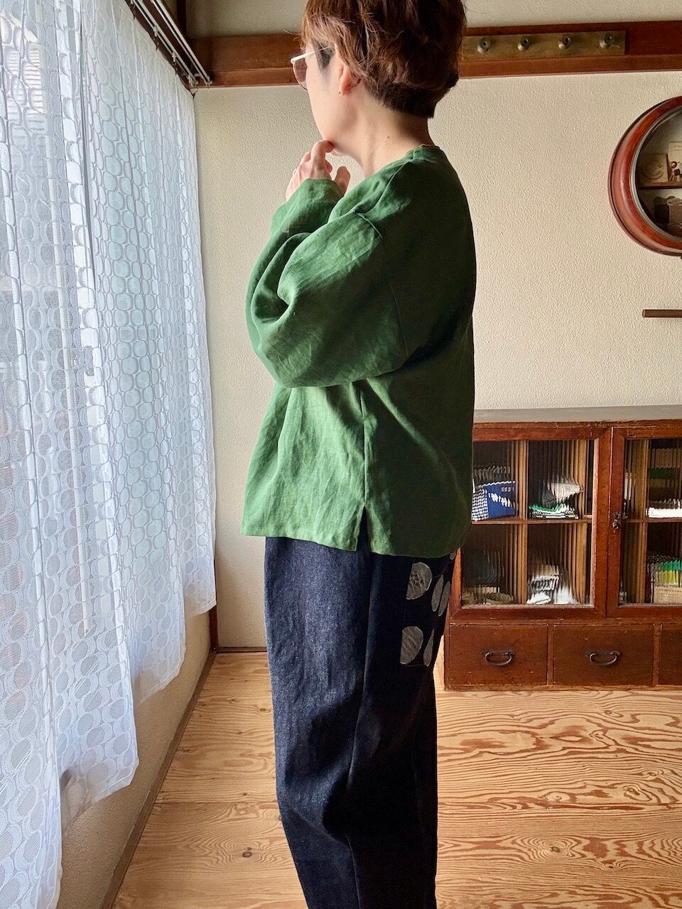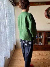 ノーカラーシャツ/リネン・グリーン